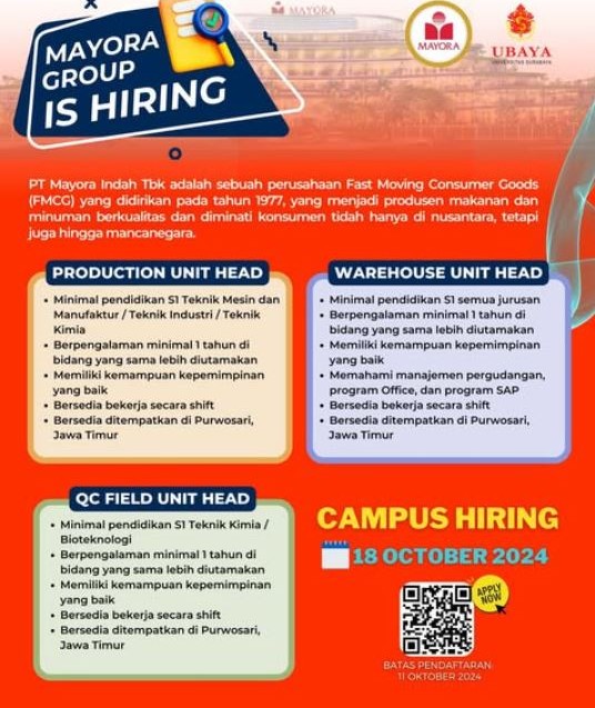 Silakan submit CV Anda di link https://bit.ly/MAYORA_UBAYA2024 atau bisa scan QR Code yang tertera di e-flyer.