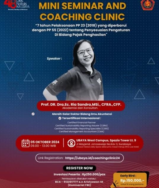 Dengan hanya investasi *sebesar Rp.250,000,-/org* Anda medapatkan penjelasan PRAKTIS dari praktisi perpajakan, dan konsultasi dengan para pakar di bidang pajak dalam acara *“Mini Seminar dan Coaching Clinic”* yang diselenggarakan oleh FBE UBAYA dan IKA UBAYA dalam rangka merayakan Dies Natalis dari IKA UBAYA