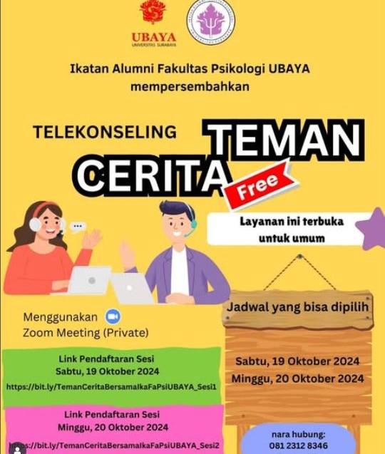 Kami *Ikatan Alumni Fakultas Psikologi Universitas Surabaya (UBAYA)* hadir kembali dengan layanan telekonseling gratis bagi Anda yang sedang membutuhkan tempat untuk bercerita.
