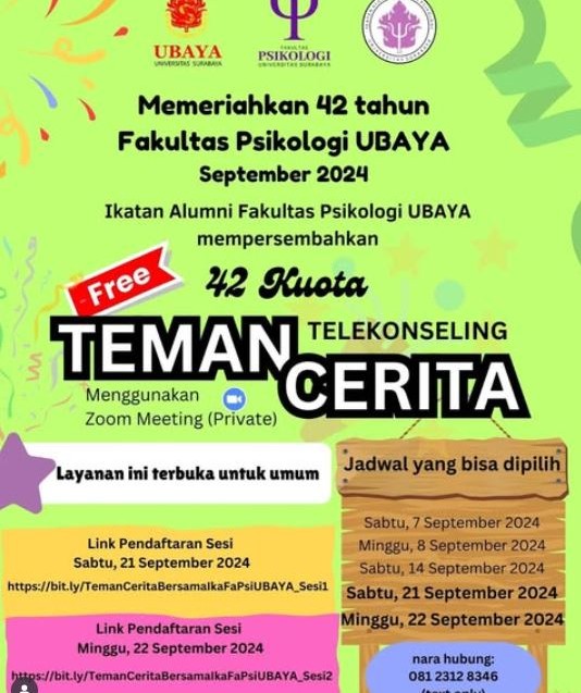 Kami *Ikatan Alumni Fakultas Psikologi Universitas Surabaya (UBAYA)* hadir kembali dengan layanan telekonseling gratis bagi Anda yang sedang membutuhkan tempat untuk bercerita.